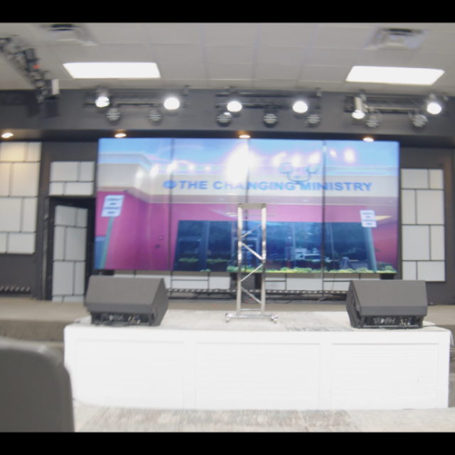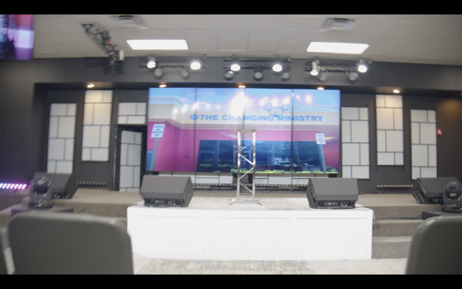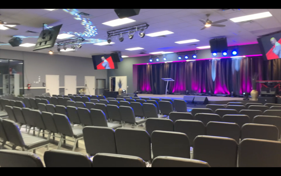 Impressive Stage: Large, elevated stage equipped with brilliant stage lighting, multiple big screen TVs, and a professional sound/video production room—perfect for dynamic presentations, live music, and streaming your services or events in crystal-clear quality.